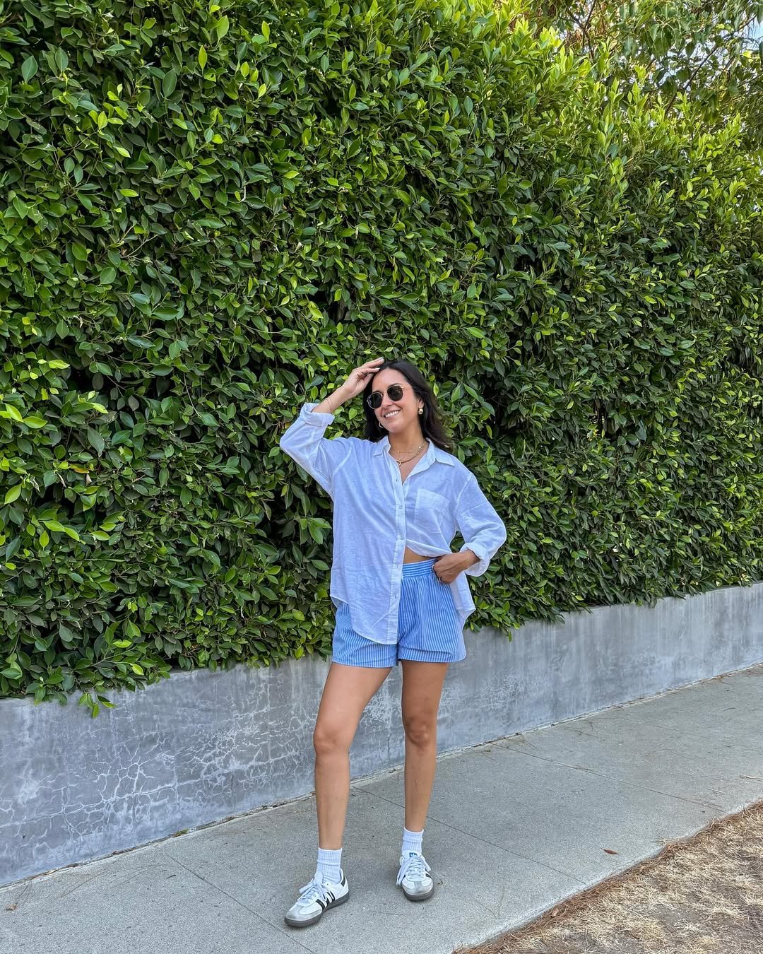 A crisp button-down paired with striped shorts feels like the grown-up version of throwing something on and heading out. Slightly undone, slightly tucked, it lands right in that sweet spot between polished and relaxed.