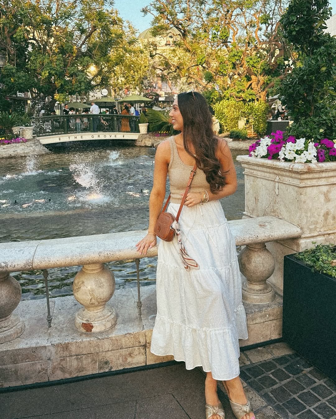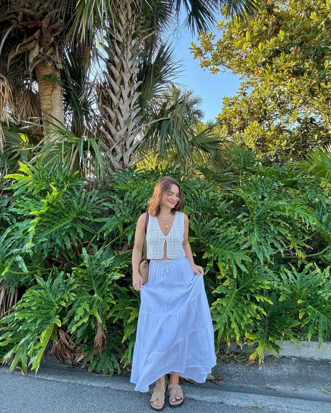A soft knit tank paired with a flowing white skirt feels right at home beside water and sunlit greenery. The palette stays grounded in warm neutrals, letting the movement of the fabric bring everything to life.