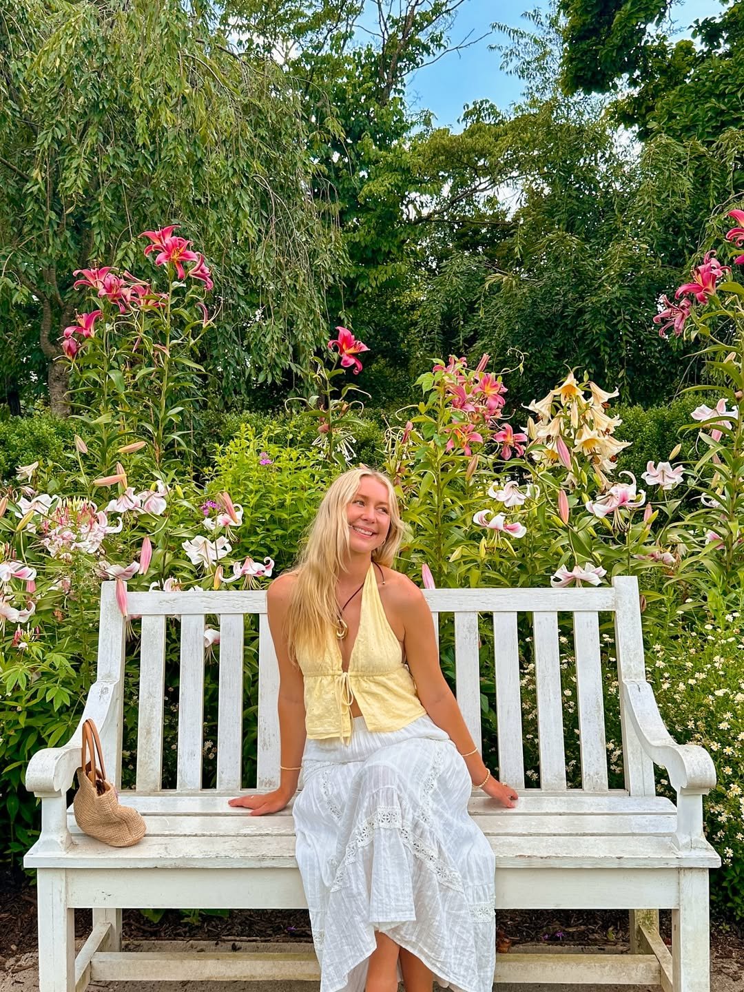 A soft yellow halter top paired with a flowing white skirt feels like something out of a slow afternoon in a blooming garden. The textures move gently, catching light in that quiet, romantic way that makes everything feel a little softer.