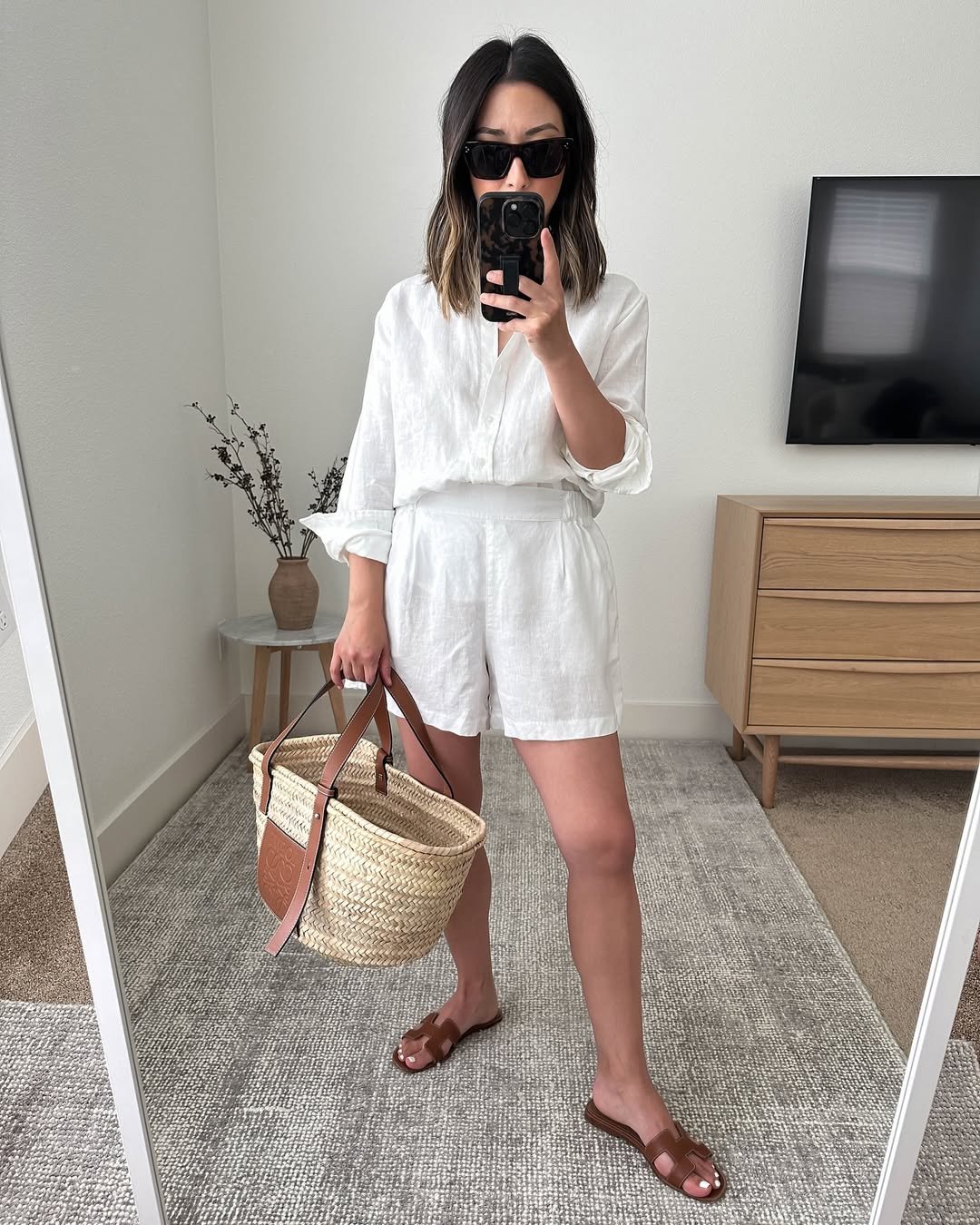 An all-white linen set with a relaxed shirt and tailored shorts feels like stepping into a slower pace. The woven tote and leather slides add warmth, breaking up the monochrome just enough.