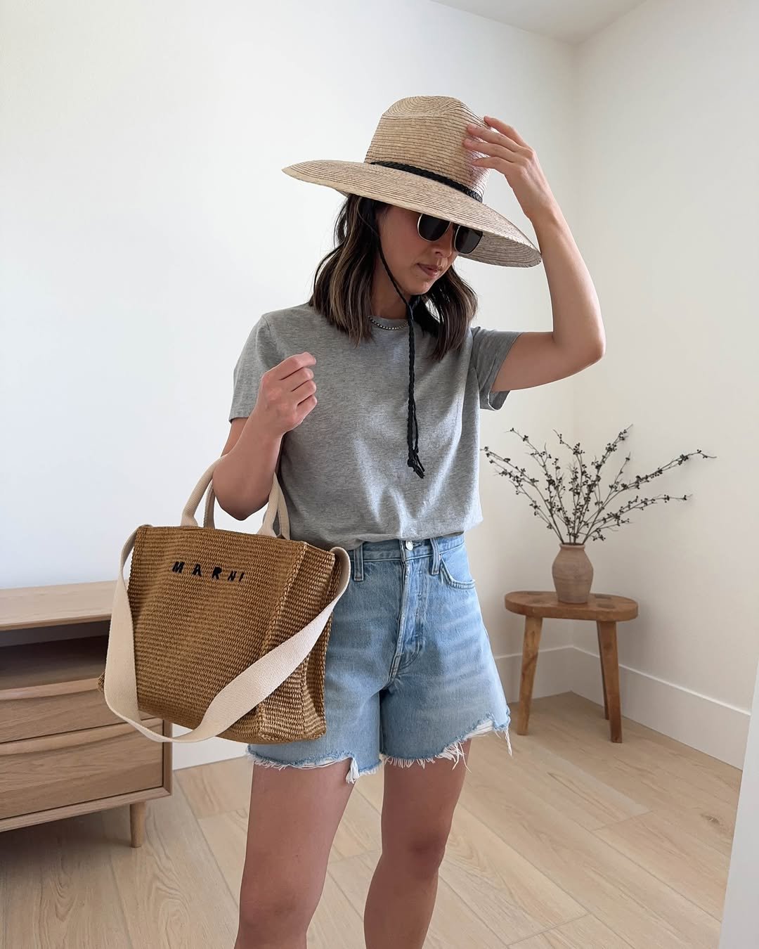 A soft grey tee tucked into denim cutoffs with a structured straw bag feels grounded and considered. The wide-brim hat adds shape, giving the whole look a subtle sense of intention.