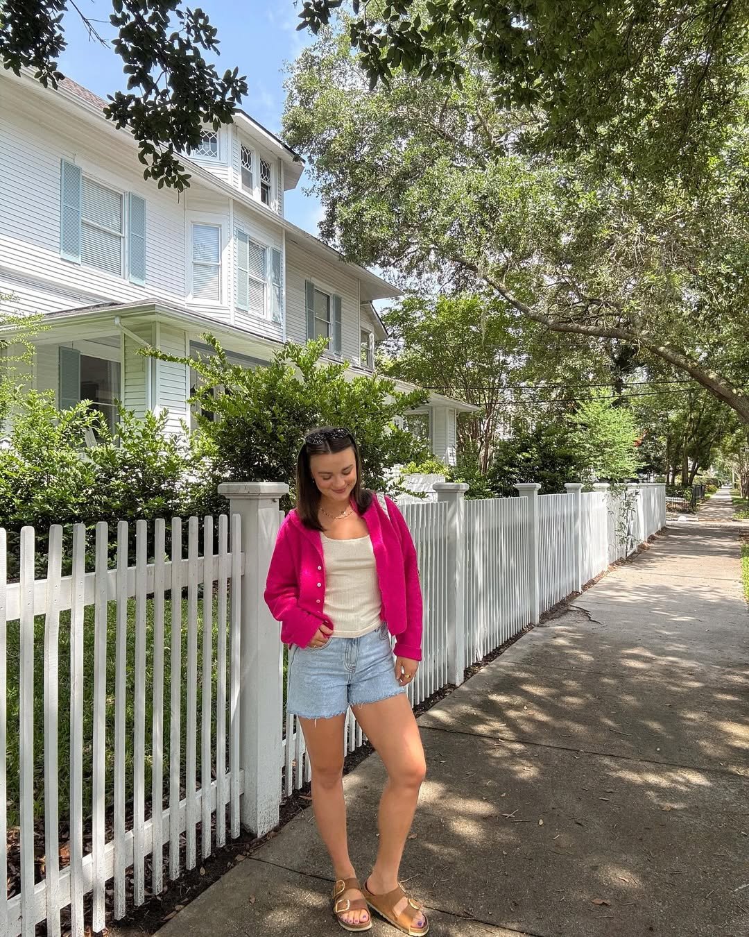 A bright pink cardigan thrown over a simple tank and denim shorts instantly lifts an everyday look into something a little more playful. Set against white picket fences and leafy streets, it feels like a quiet nod to classic neighborhood charm with a fresh twist.