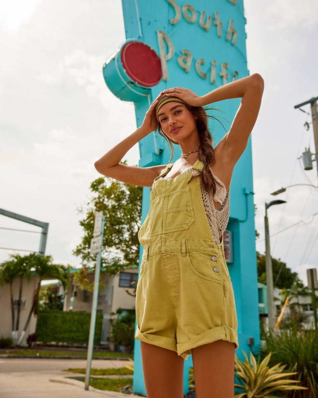 Soft yellow overalls layered over a delicate knit bring a hint of nostalgia into summer dressing. The relaxed fit and rolled hems keep it casual, while the color adds a cheerful lift.