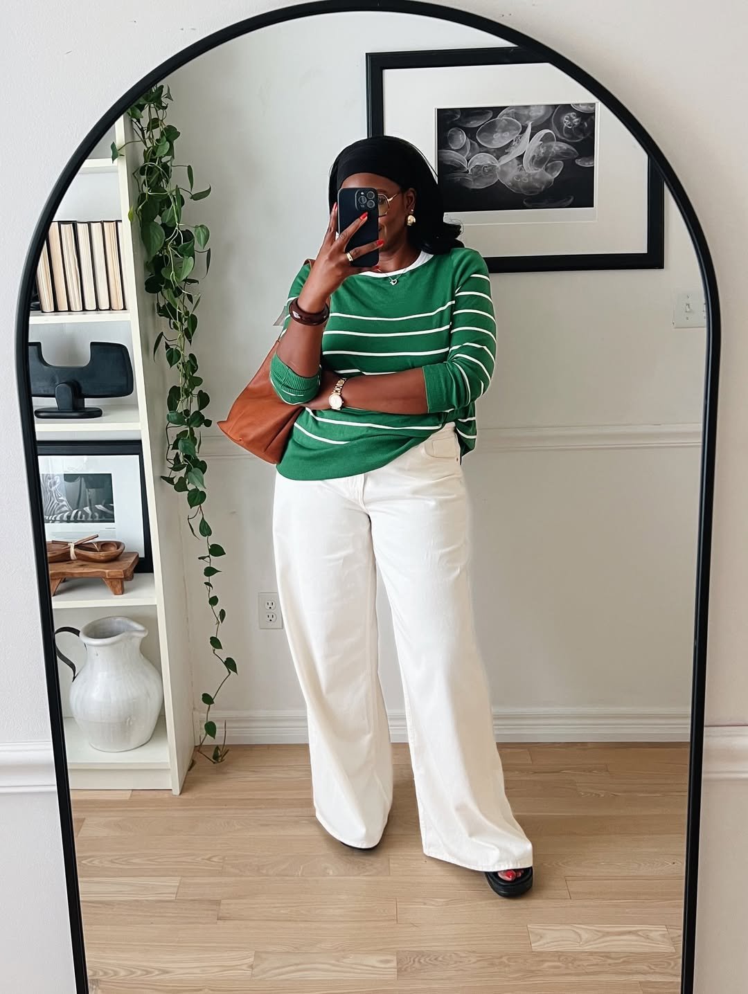 A green striped knit paired with wide-leg white trousers feels clean, tailored, and quietly elevated. The setting mirrors the outfit, minimal, airy, and intentional.
