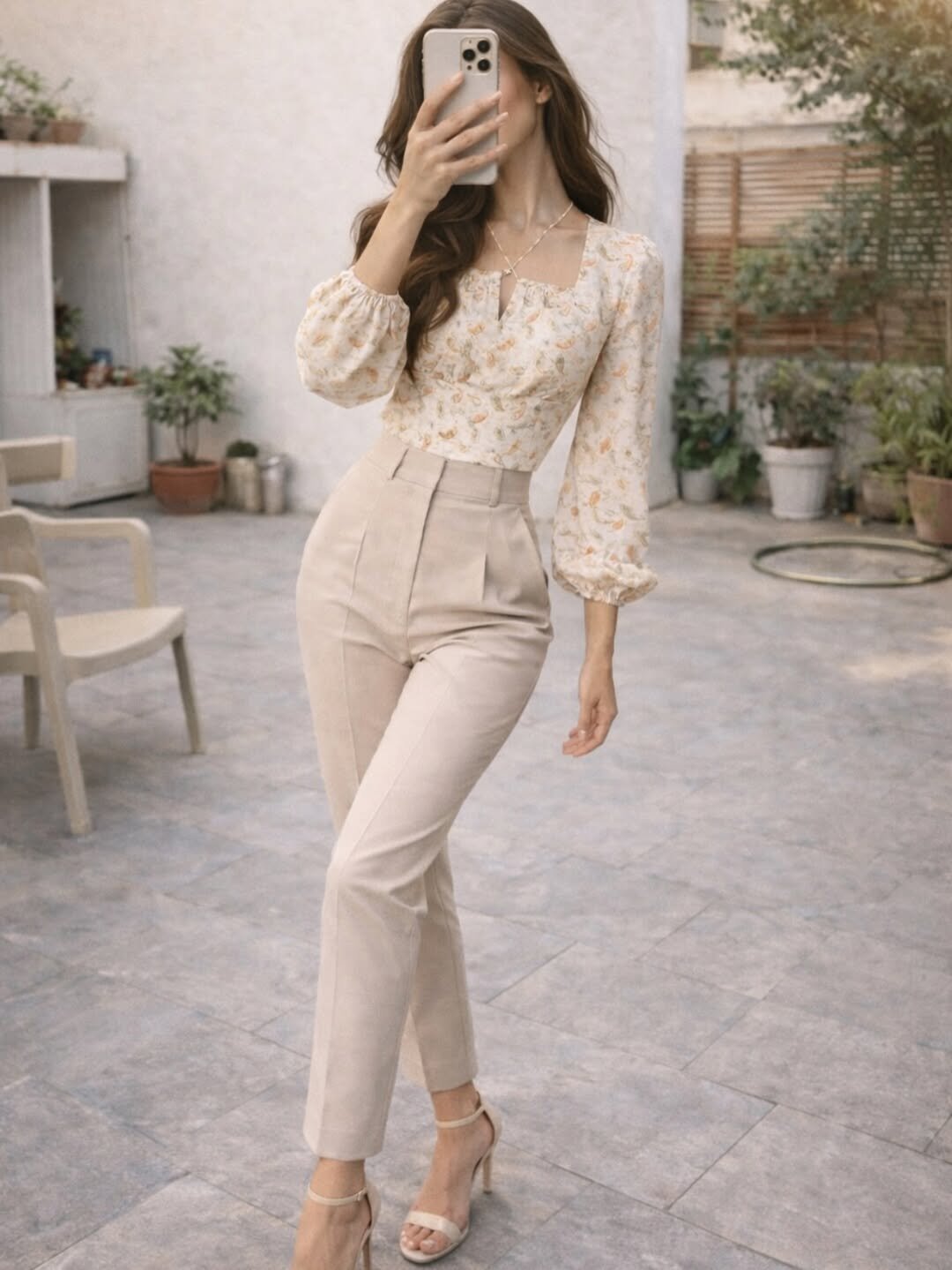 A delicate floral blouse tucked into tailored neutral trousers brings a refined softness that feels timeless. The gentle puff sleeves and subtle print add dimension without overpowering the look.