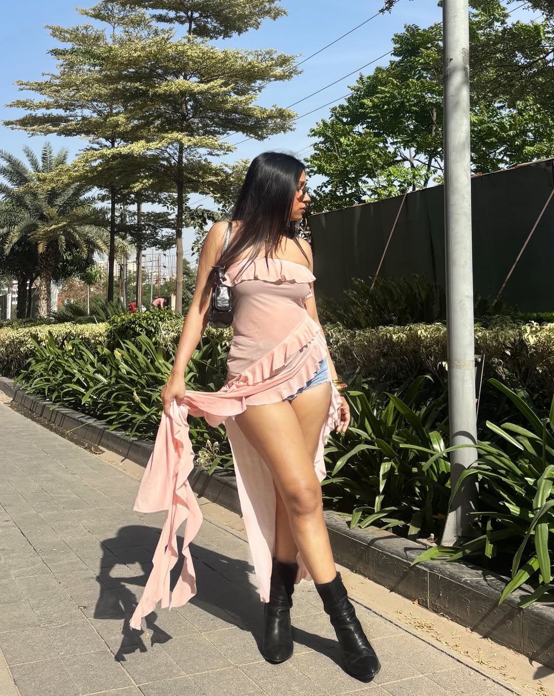 A flowing pink ruffle dress layered over denim shorts adds movement and just a hint of drama to a casual street setting. Paired with boots, it creates that contrast between soft and strong.