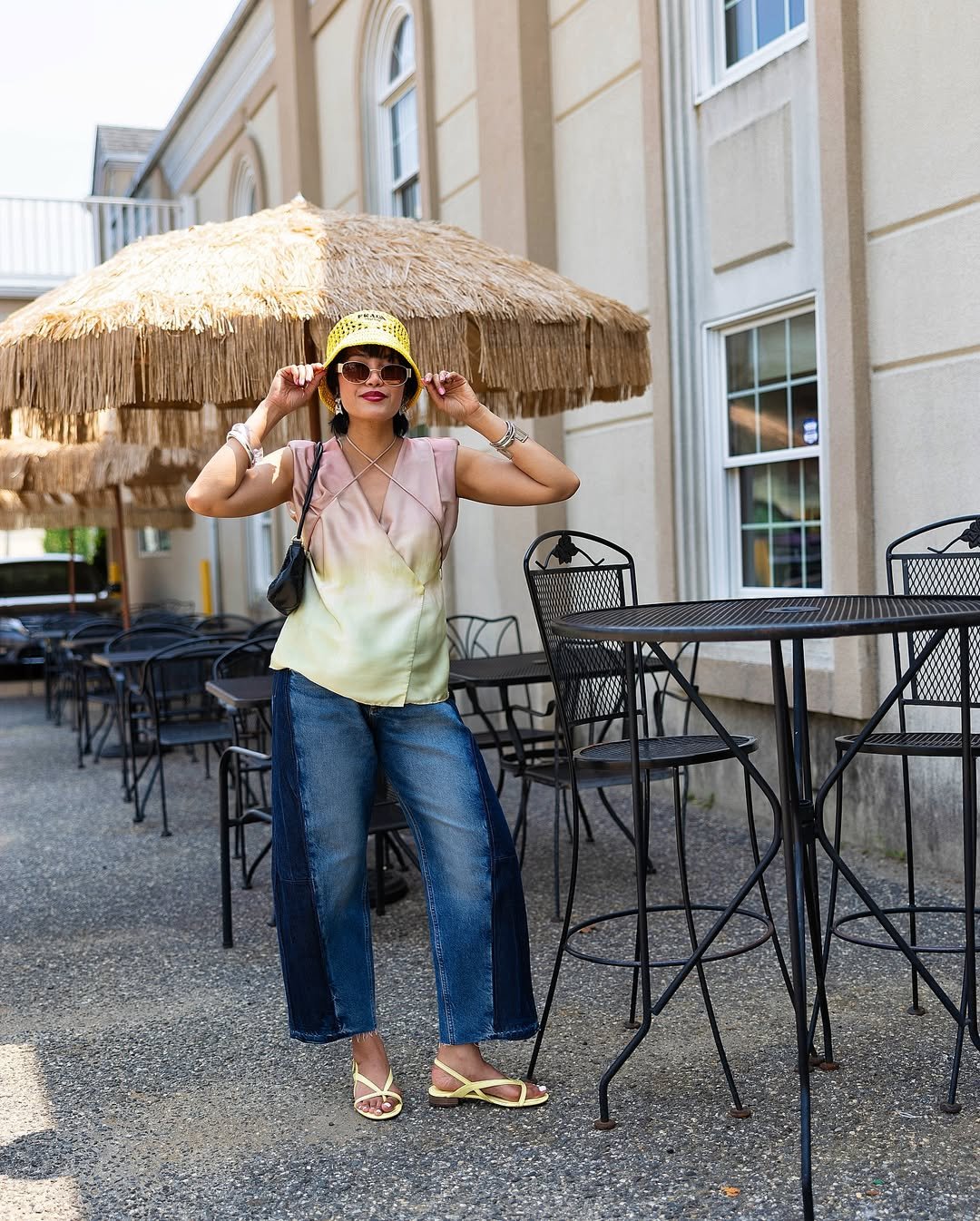 A silky ombre top shifting from soft blush to pale green paired with cropped denim feels light and a little unexpected. Add a woven hat and delicate sandals, and it leans into that carefree, end-of-day glow.