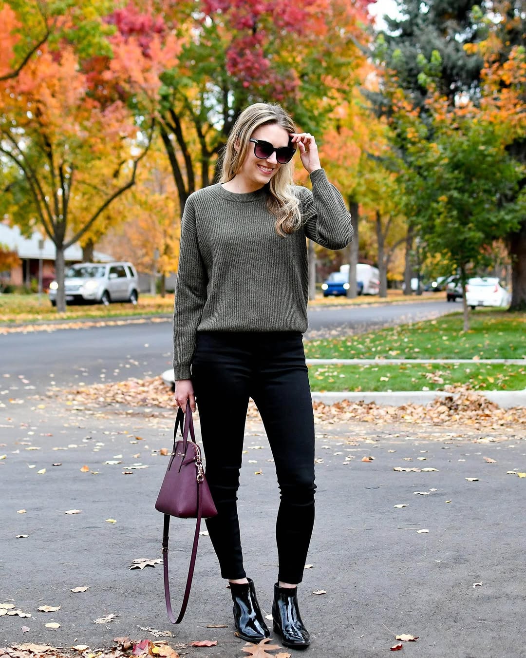 The crisp backdrop of autumn leaves makes @cottoncashmerecathair’s look shine even brighter. A mossy olive knit tucked into sleek black jeans—simple, classic, and completely seasonless. It’s the kind of outfit that feels right at home from day to dinner.