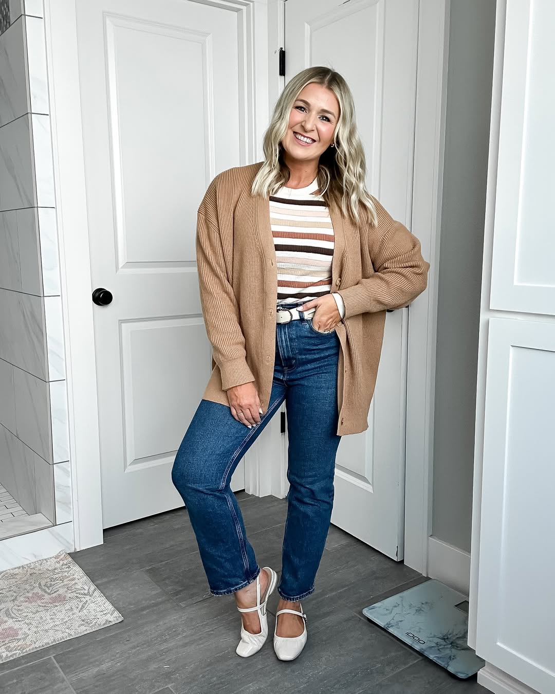@styled.by.luxe gives us a down-to-earth, girl-next-door outfit that still feels totally intentional. A striped knit top in warm, neutral tones is paired with a camel cardigan and classic blue jeans, creating a balanced look that’s cozy but not bulky.