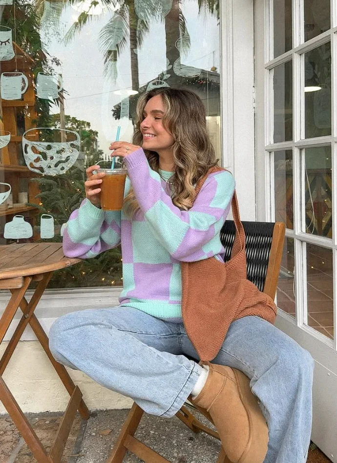 There’s something so inviting about @kristennroy’s soft pastel look — like a cozy morning coffee run in your favorite town. Her mint-and-lilac checkered sweater adds a splash of playfulness, while the light denim and tan boots keep things grounded and warm.