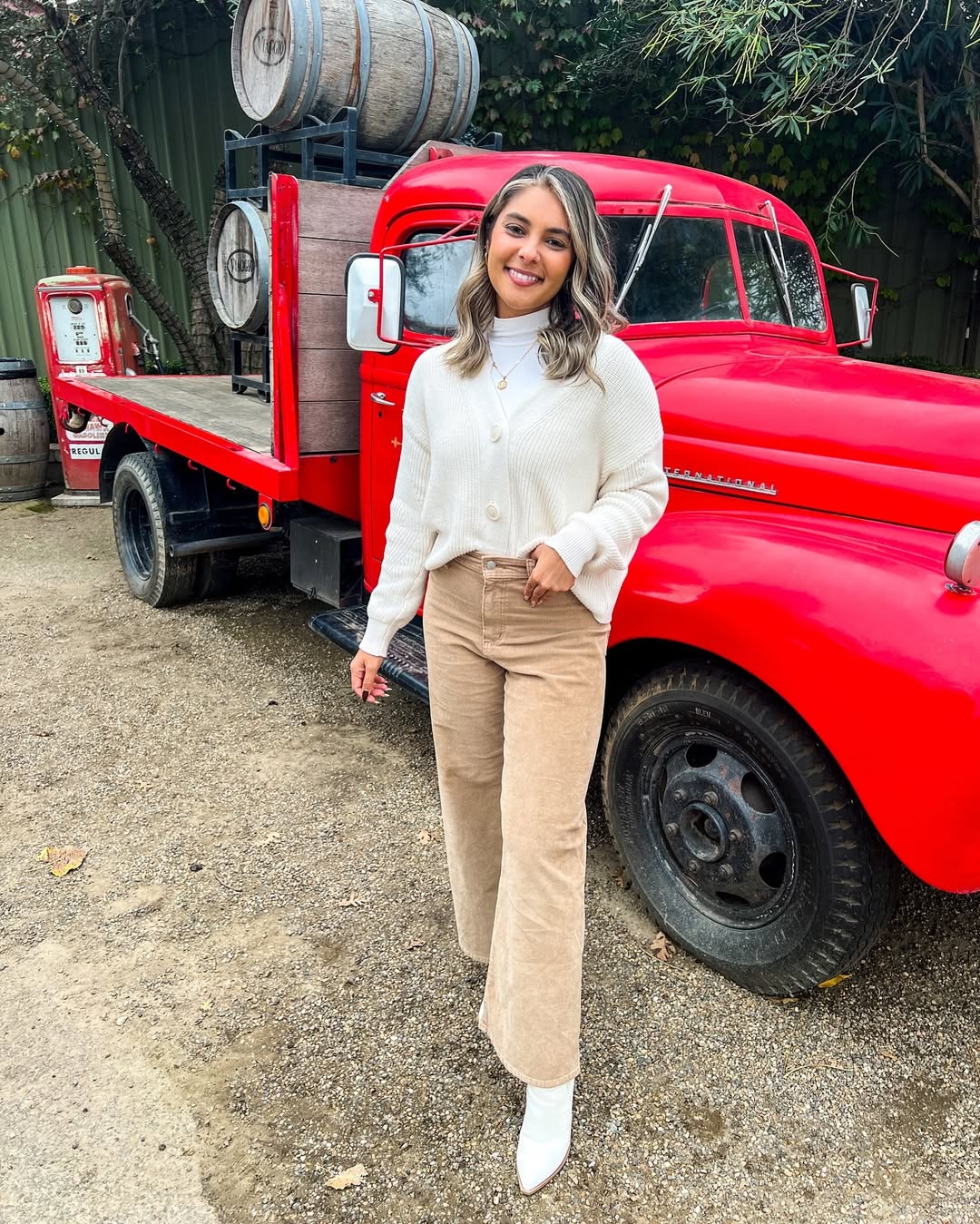 This is the kind of outfit you can wear to a cozy countryside gathering or a low-key urban dinner. It’s dressed, but not try-hard. And most importantly? It looks just as good seated on a couch as it does posing next to a vintage red truck.