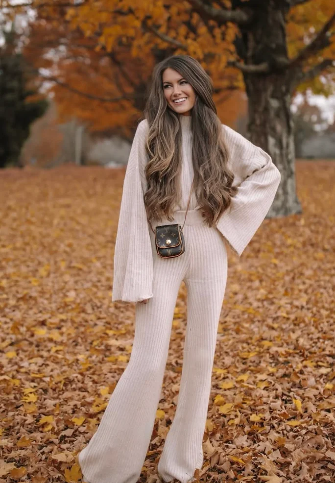 If fall could be captured in one look, @cmcoving’s ribbed knit set would be it. The creamy beige tone, the flared hem, the soft bell sleeves—it’s giving ultimate comfort-meets-style energy. Perfect for lounging with family or curling up with dessert after dinner.