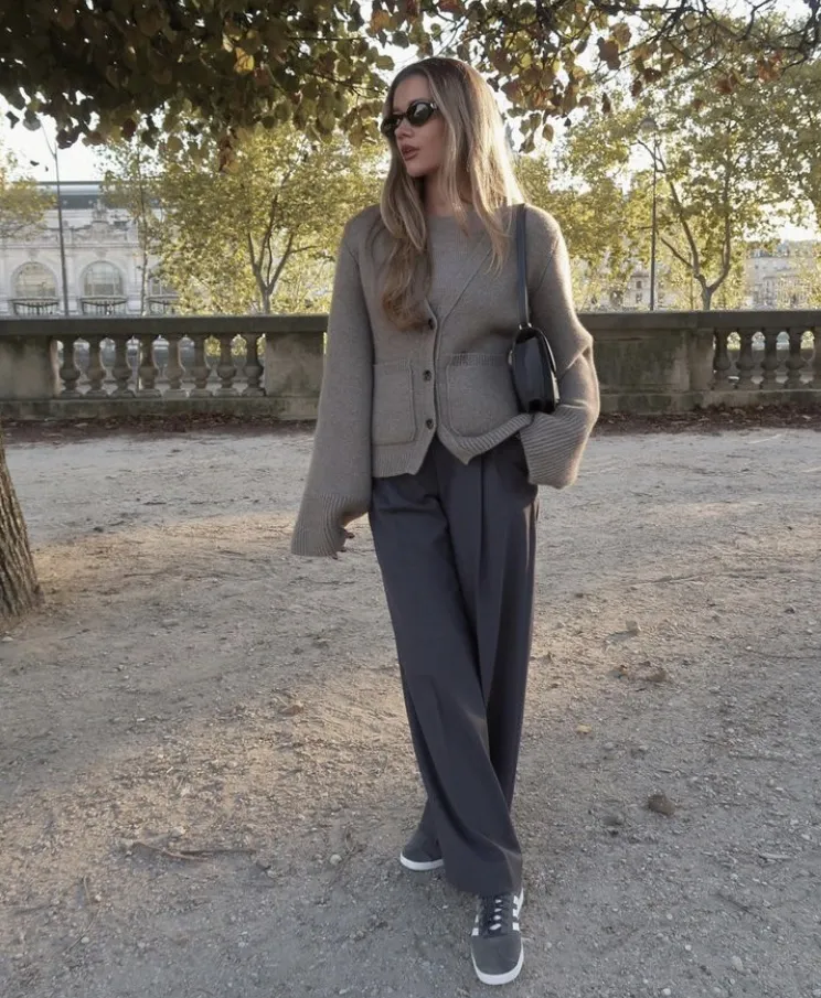 The cardigan, worn open over a tonal sweater, adds a sense of ease, while the wide-leg pants create graceful movement with every step. Add in sleek sneakers and oversized sunnies, and it’s instantly elevated without feeling “done.”