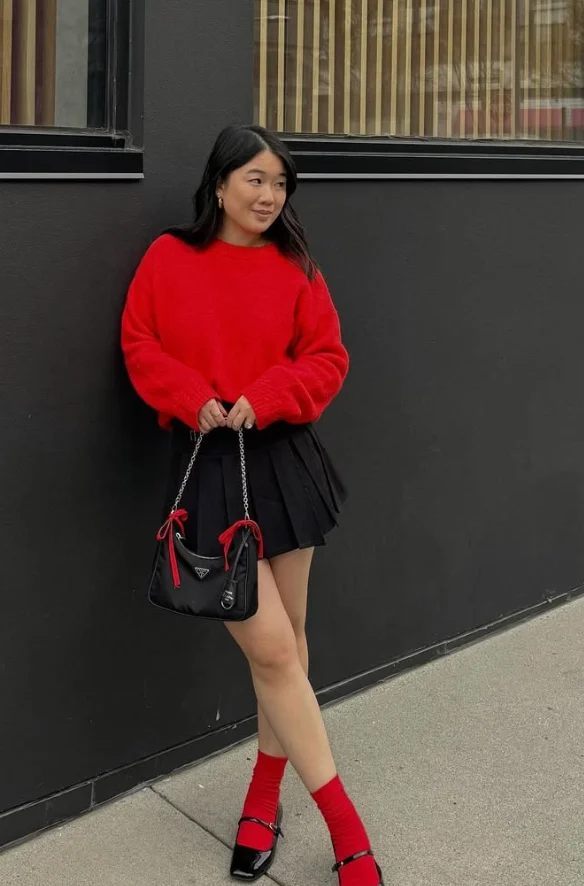 @stylishwitht is serving major holiday energy in this red-on-black combo that feels cheeky, chic, and unapologetically fun. The bright red sweater is the star here—oversized and cozy with just the right amount of volume, while the black pleated mini and coordinating red socks pull it all together.