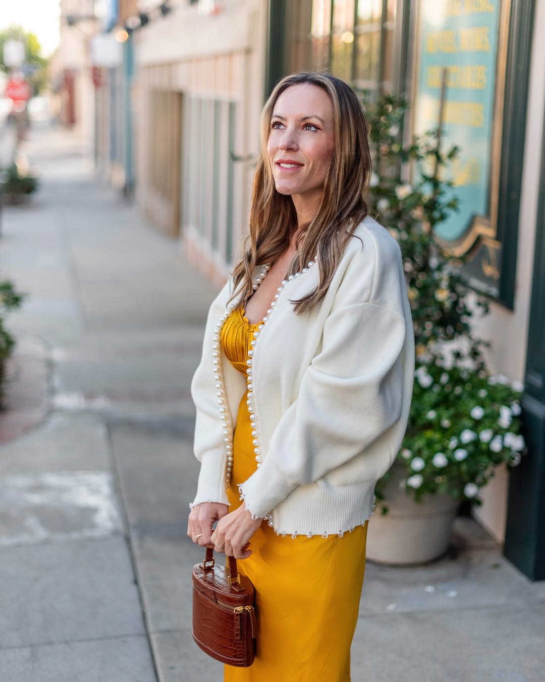The look feels made for a Thanksgiving that calls for something a touch dressier — maybe dinner at a charming downtown bistro or a family gathering that leans “cocktail casual.” The rich yellow hue adds that little bit of sunshine we all crave on cooler days, while the creamy cardigan keeps it grounded and approachable.