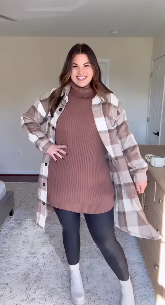 @kelly_elizabethxo’s outfit is basically autumn in one frame. A ribbed sweater dress in warm cocoa tones, topped with a plaid shacket, creates the ultimate comfy Thanksgiving combo. Add black leggings and chunky boots, and you’re ready for both style and second helpings.