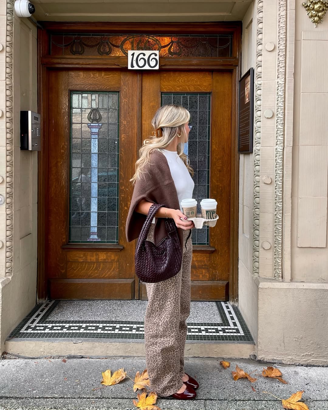 There’s something so effortlessly elegant about a coffee run done right. @izzydilg brings cozy sophistication to the streets with her rich brown wrap layered over a white top, paired with leopard-print trousers that strike just the right balance between playful and polished. The woven handbag and glossy flats tie the look together with texture and warmth.