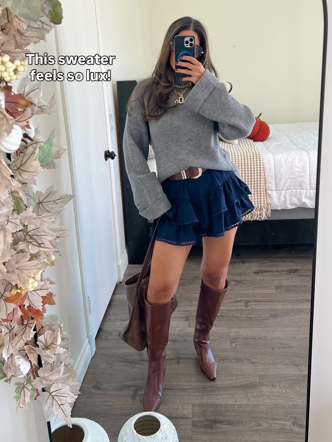 It’s giving modern-day cowgirl meets city chic. @mar.storosian’s pairing of a chunky gray knit with a flouncy navy mini skirt feels equal parts cozy and glam. The oversized sleeves add drama, while the rich textures keep it luxe. And those brown knee-high boots? The perfect finishing touch to anchor the whole look.