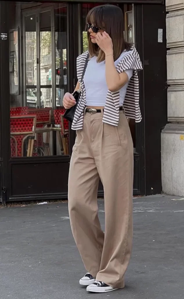 @everlane’s outfit is the definition of clean, Paris-inspired simplicity. The crisp white tee and beige wide-leg trousers create a silhouette that feels timeless, while the striped sweater tossed over her shoulders adds just the right amount of nonchalance.