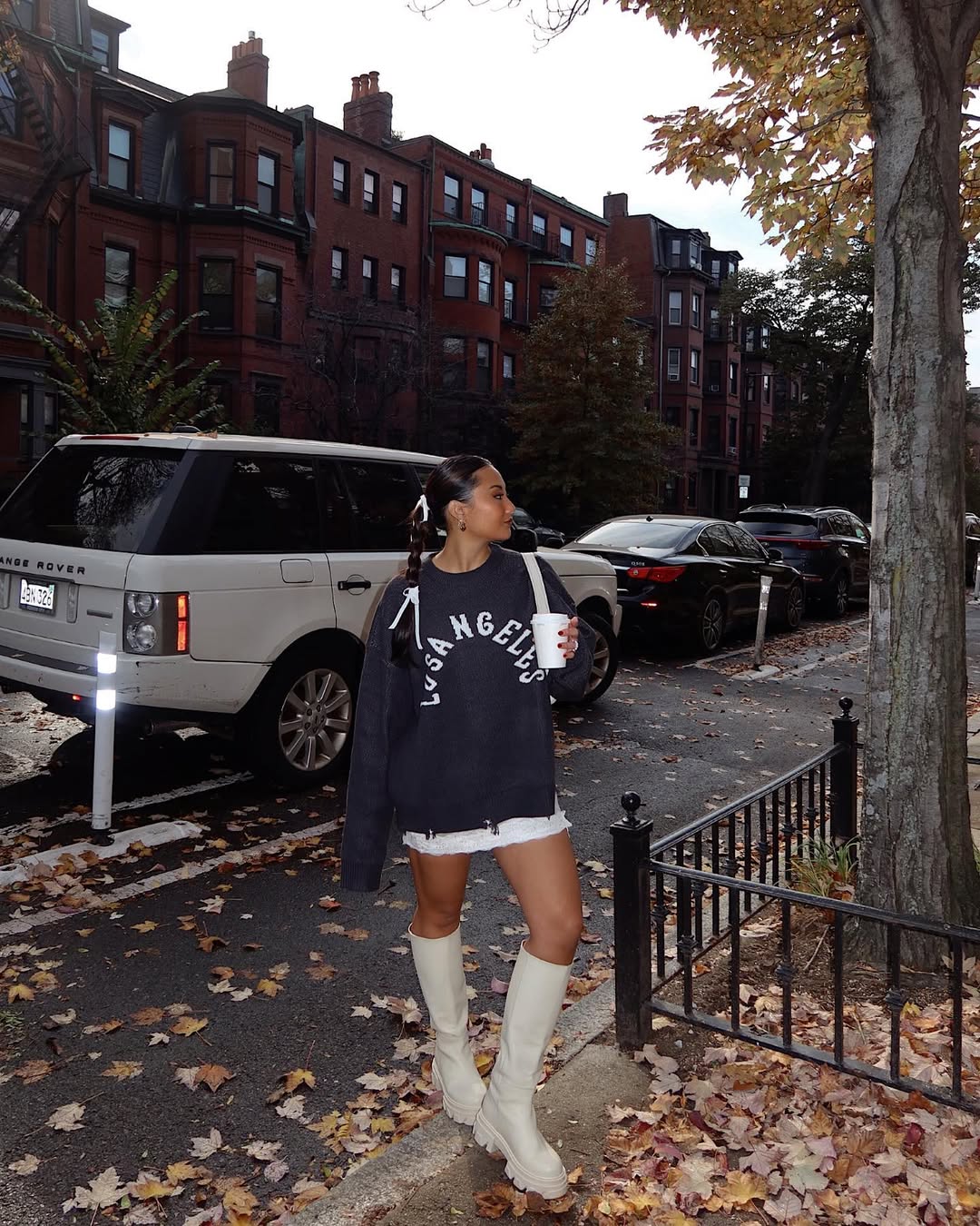 In her second look, @lourlinmarie turns cozy into a statement. The oversized “Los Angeles” sweatshirt, crisp white shorts, and tall cream boots blend comfort and street style in a way that feels so now.
