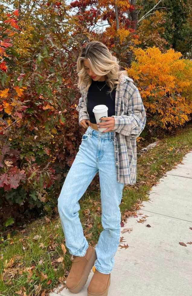 Plaid and denim are the heart of fall, and @audreymckayyy proves why they’ll never go out of style. Her laid-back combo of a cropped black tee, oversized flannel, and light-wash jeans feels youthful and easygoing.
