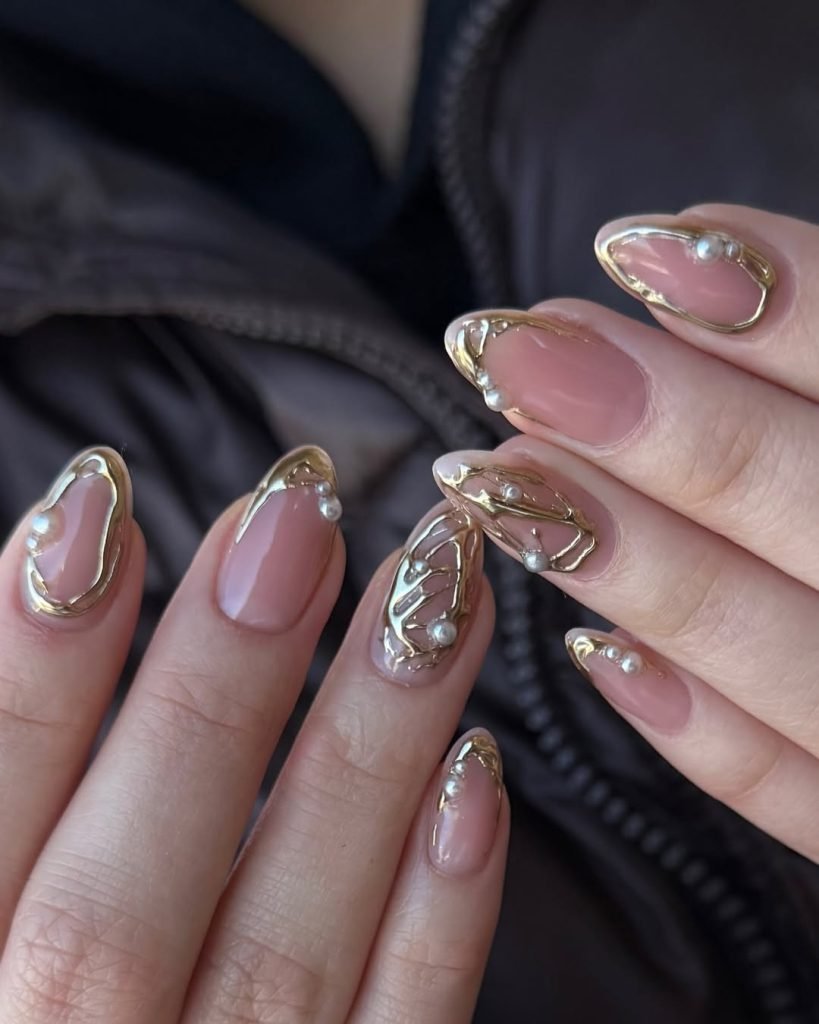 This one’s the definition of soft-glam perfection. Blush-toned nude meets molten gold framing, with tiny pearls nestled into the design for an extra layer of richness. It’s structured yet fluid, like wearable jewelry.