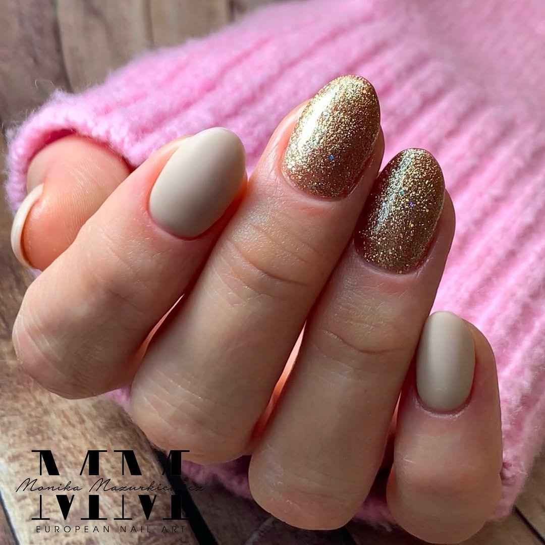 There’s something undeniably cozy yet glamorous about this set from @monikamazurkiewicznj. The mix of velvety matte beige and rich gold glitter feels like wrapping yourself in a cashmere sweater while sipping something bubbly. It’s minimalism with a little holiday magic.