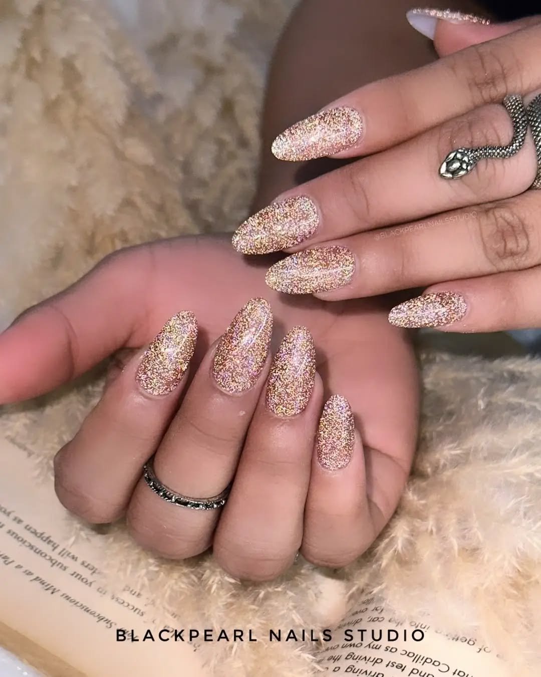 Nothing says “festive elegance” quite like a full set of champagne glitter nails. This look from @blackpearlnailsstudio sparkles with every flick of the wrist — it’s the kind of mani that feels made for candlelit dinners and velvet evenings. The shimmer is multidimensional, catching soft pink, gold, and rose tones under the light for that champagne-bubble glow.