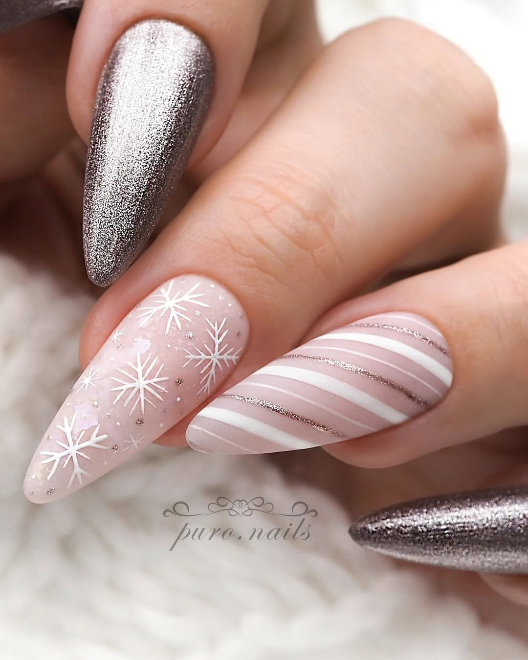 @ideas_for_nailart brings holiday glamour to life with this mix of metallic mocha and frosted blush. The snowflake and candy-stripe designs feel whimsical yet refined — like sipping champagne by the fire on a snowy evening.