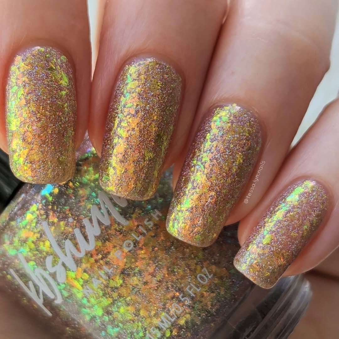 This @tessa.lyn.nails masterpiece feels like pure molten sunlight captured on your fingertips. The golden-champagne flakes shift from honey to soft lime and copper under the light, creating a multidimensional glow that’s endlessly fascinating. It’s shimmery but with depth — like champagne bubbles frozen mid-rise.