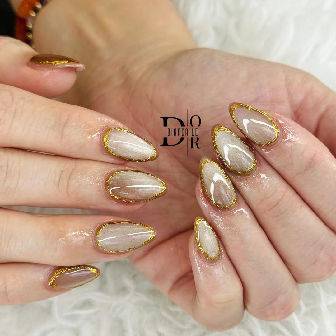 This mani feels like a fine piece of jewelry for your hands. The translucent beige base keeps things soft and wearable, while the golden border elevates the entire design into something couture. Think golden hour light on silk curtains — subtle yet breathtaking.