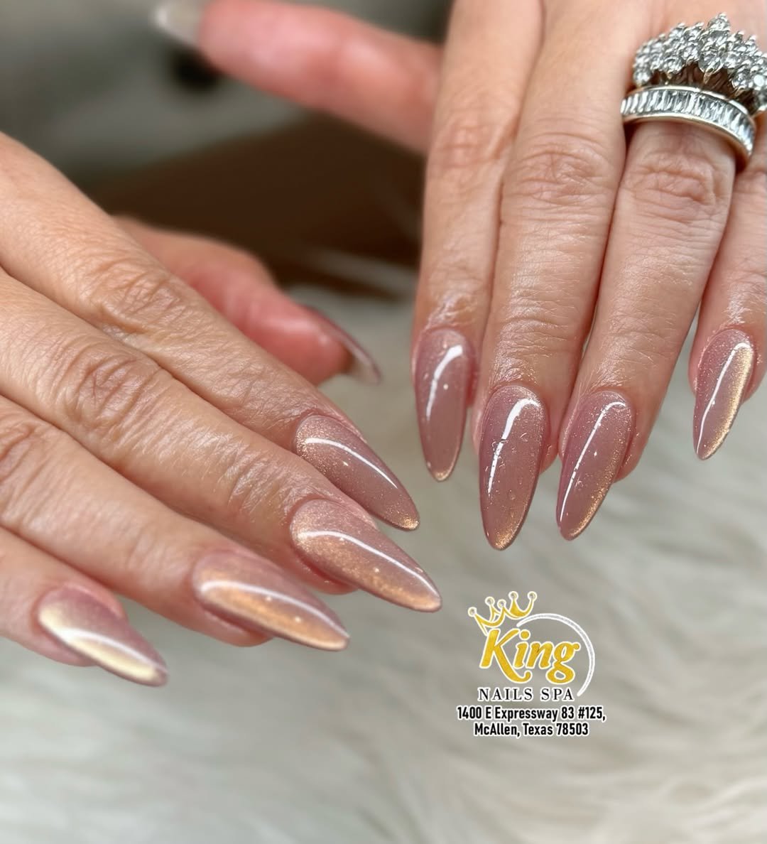 This look from @kingnailsmcallen feels like golden hour captured in polish. The nails shimmer with a silky champagne hue that fades softly from nude to warm metallic, reflecting light with every subtle move. It’s glossy, feminine, and quietly confident—like that perfect sunset selfie you didn’t even try too hard to take.