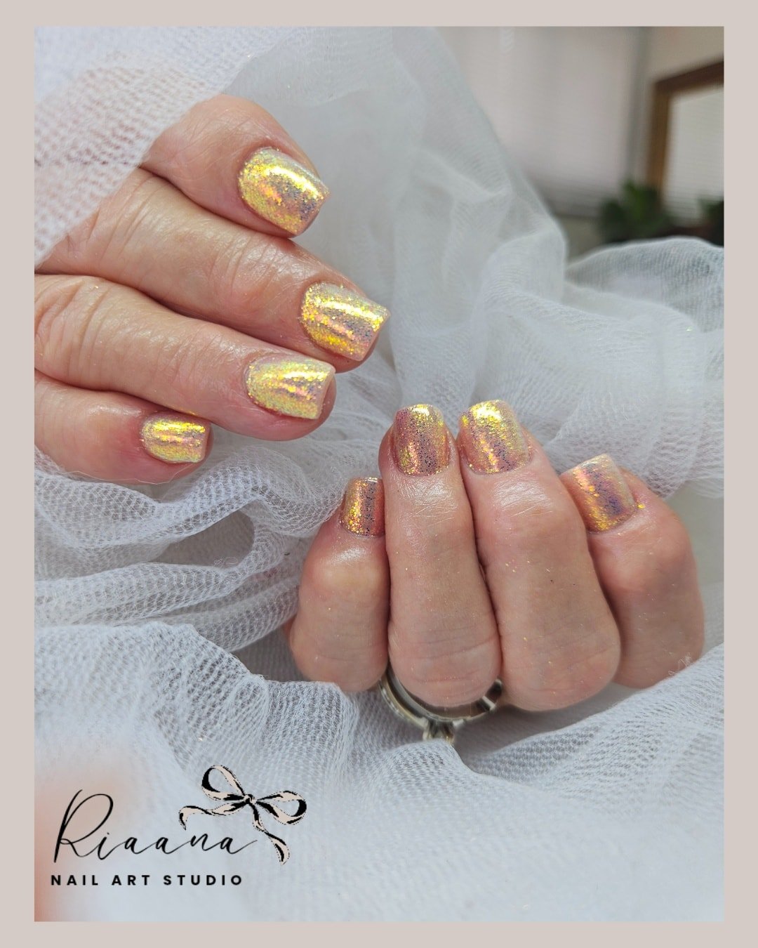 @riaana_nail_art_studio’s golden foil nails glow like melted champagne under soft light. The iridescent flakes shift from pale gold to hints of rose and peach, creating a mesmerizing, multi-tonal effect.