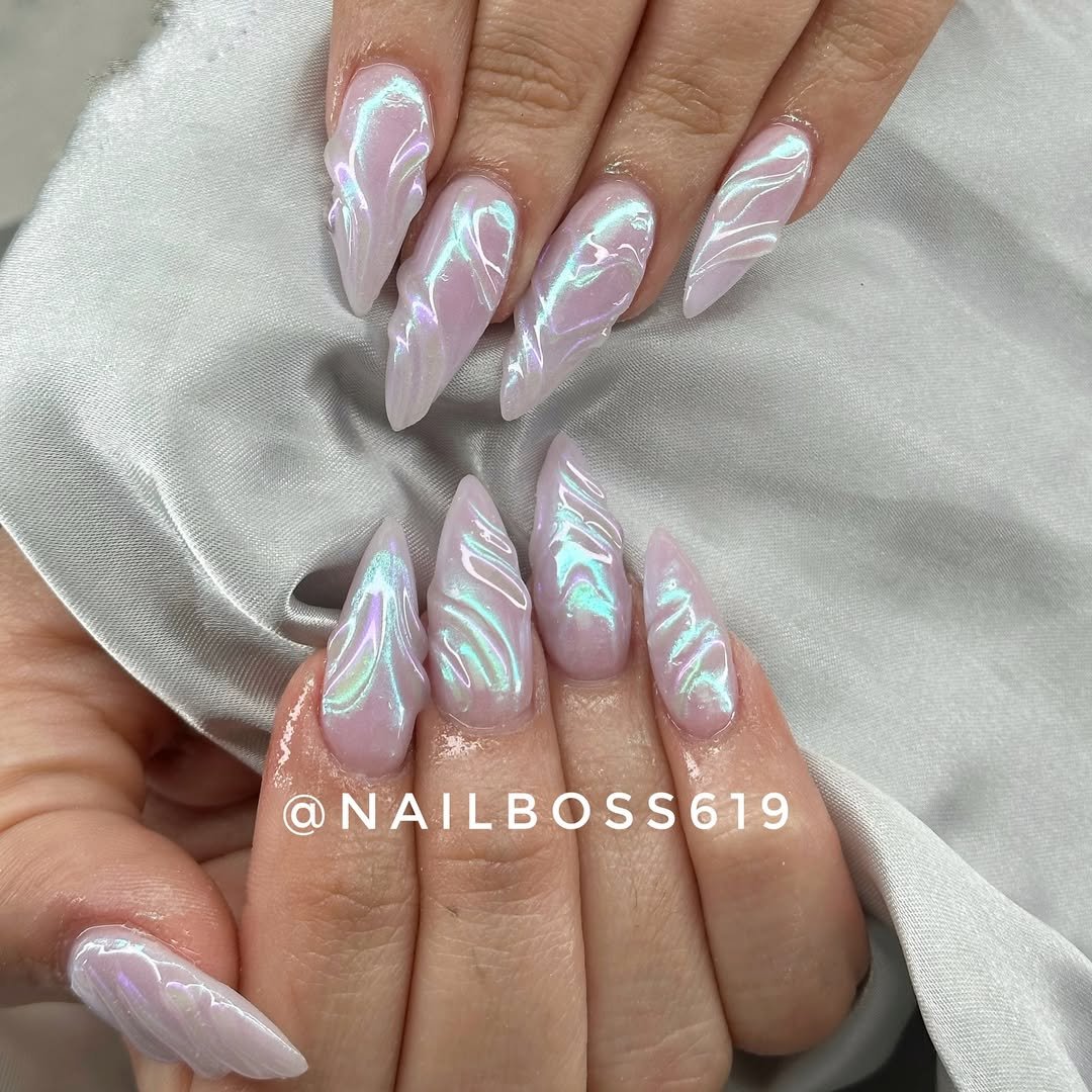 @nailboss619 took champagne shimmer to another level with these sculptural, glazed nails that glow from within. The milky pink base shifts under the light, revealing ripples of opal and icy champagne tones that look almost holographic.