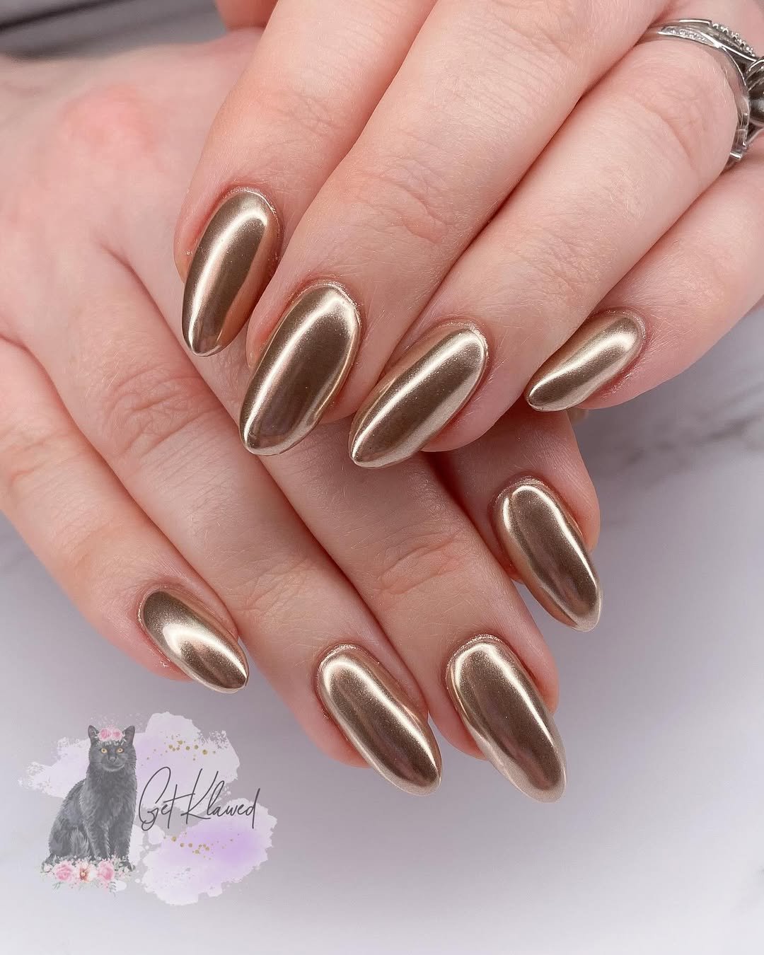 This molten champagne chrome by @getklawed is pure radiance in nail form. The high-shine metallic finish feels almost mirror-like — a perfect reflection of the golden hour glow. It’s sleek, futuristic, and undeniably luxurious.