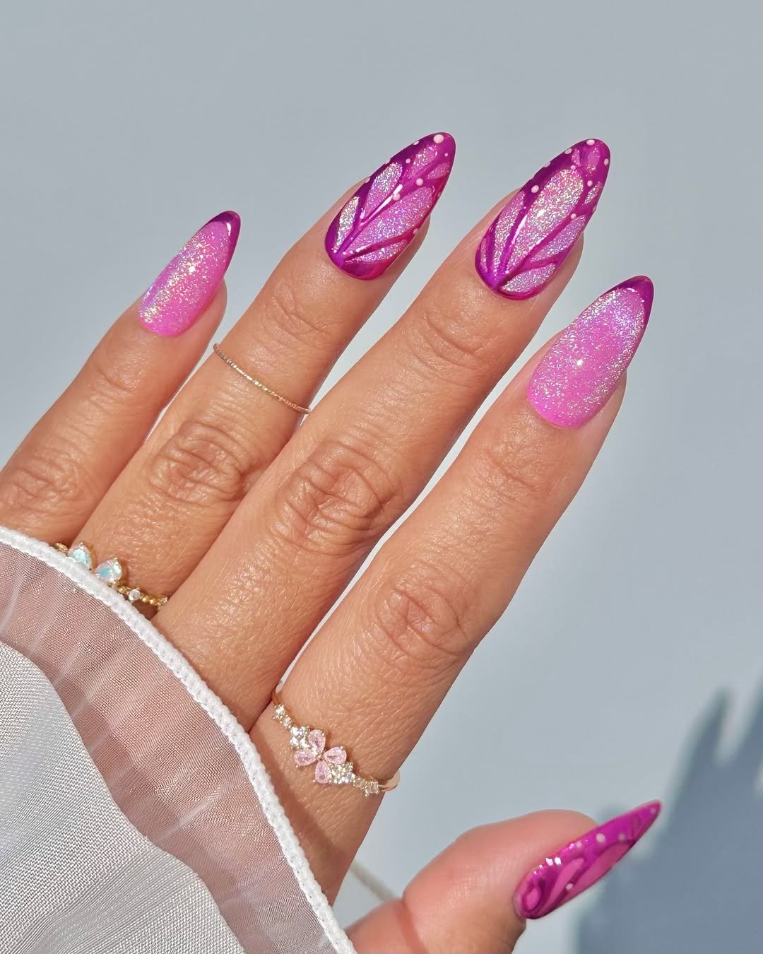 @daily_charme gives us a flirty twist on the champagne palette with this fuchsia-meets-bubble-pink design that practically glows. The gradient shimmer base has that effervescent, champagne-fizz sparkle, while the butterfly wing detailing adds a touch of playful fantasy. It’s the kind of mani that feels like sunset over sparkling rosé — bold but still soft.