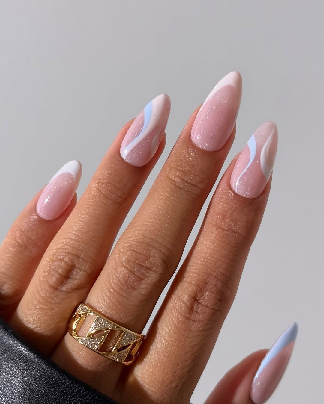 There’s a playful sweetness to this look by @pearliepressed. Delicate blush tones swirl together with creamy white and a whisper of shimmer, creating a mani that feels soft, fresh, and utterly romantic.