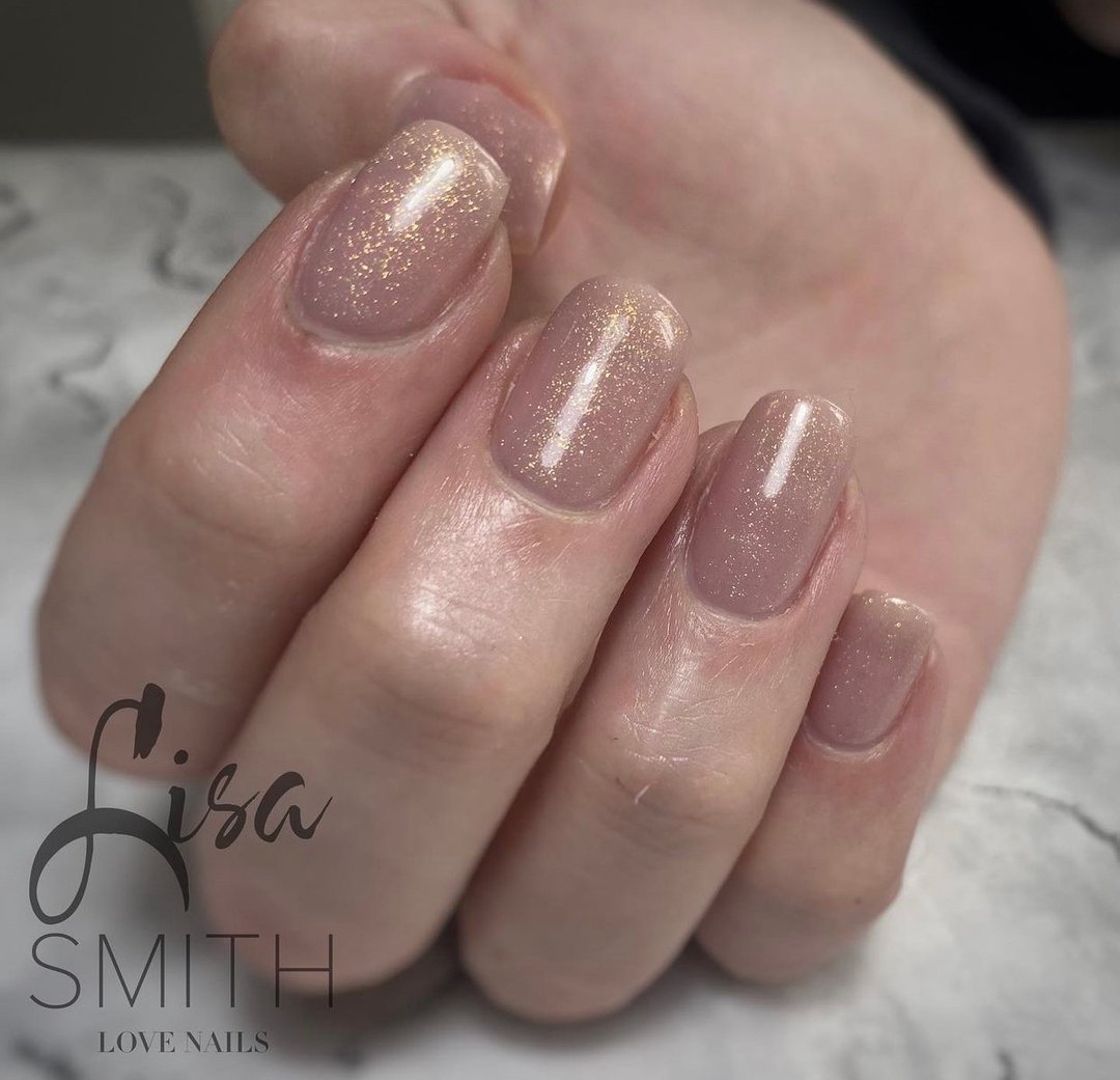 Delicate, creamy nude with the faintest champagne shimmer—@supernailprofessional nails the art of refined simplicity. The finish is soft and semi-sheer, with fine gold dust peeking through the neutral tone.