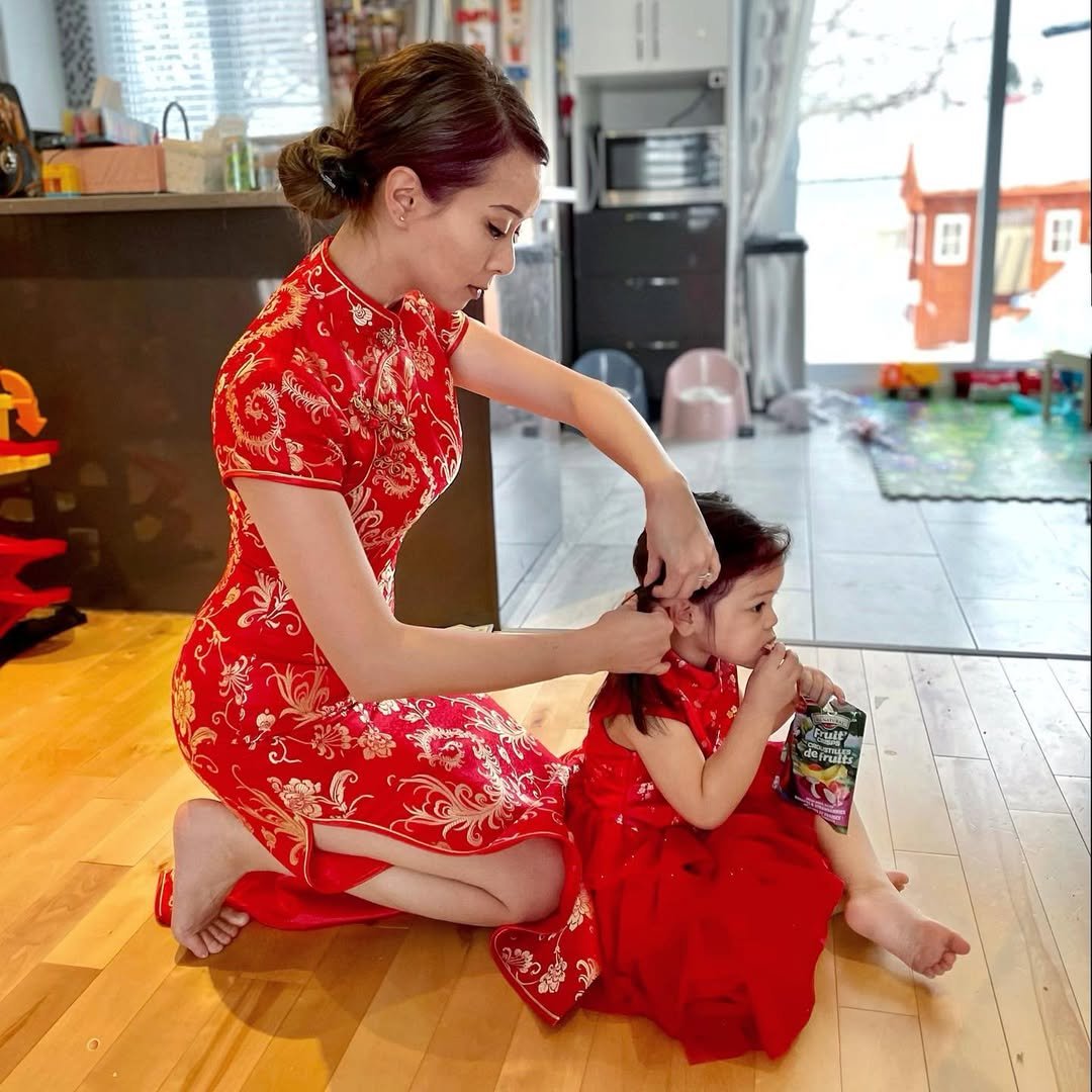 This is Chinese New Year as it really happens—at home, on the floor, mid-chaos, still dressed beautifully. The red dress does the heavy lifting, but the moment makes it special.