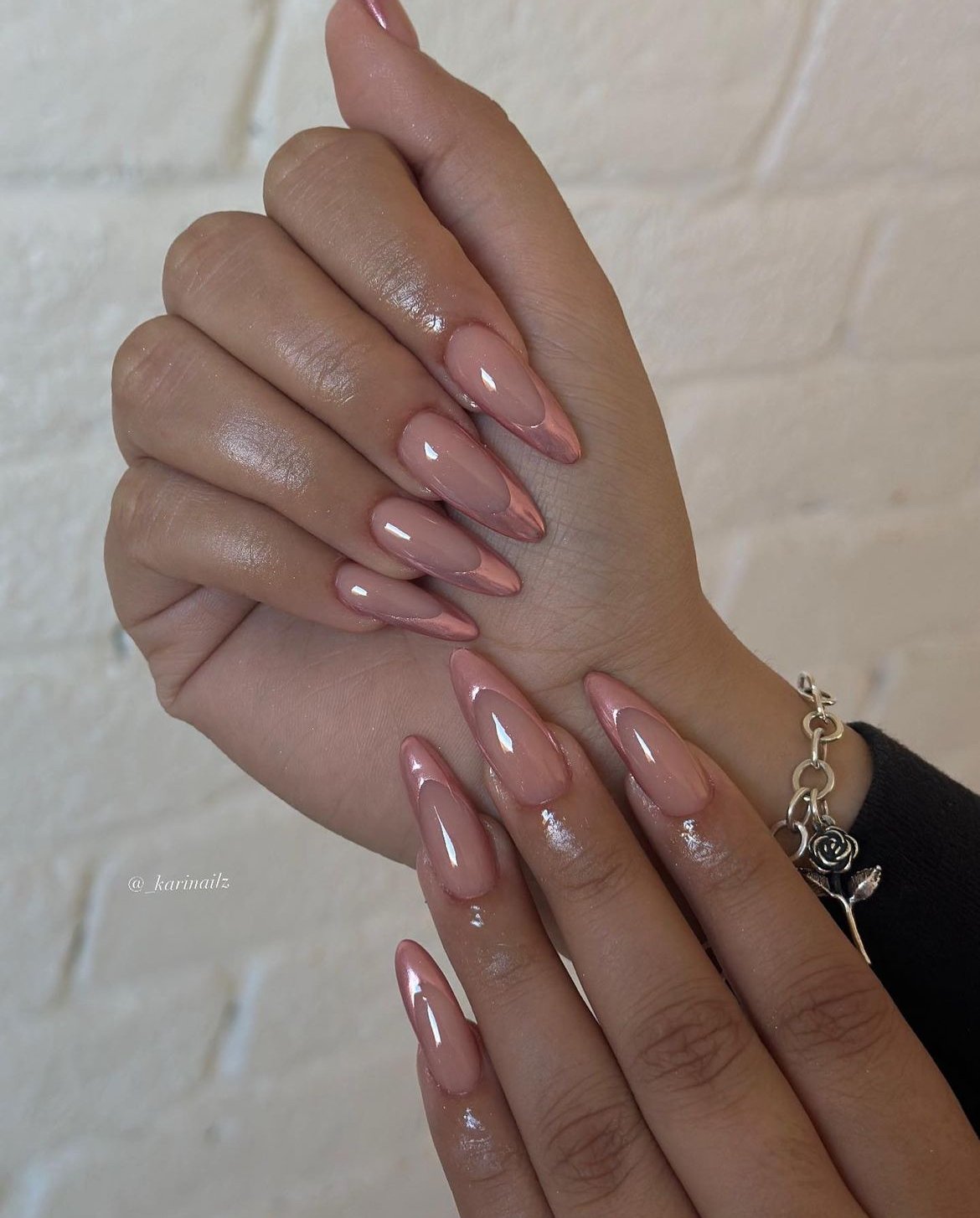 These almond-shaped chrome pink nails are pure glam in the most effortless way. The glossy nude base blends seamlessly into that reflective rose chrome tip, giving the whole set a sleek and elongated look that flatters the fingers beautifully.