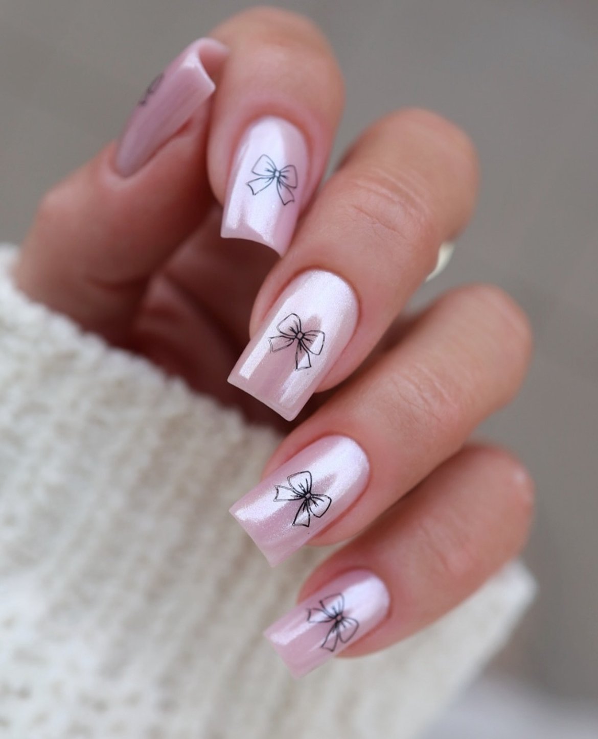 These soft chrome pink nails feel like the manicure version of a satin ribbon. The pearly pink shimmer creates that dreamy chrome glow, while the delicate black bow outlines add a playful, feminine touch that instantly catches the eye.