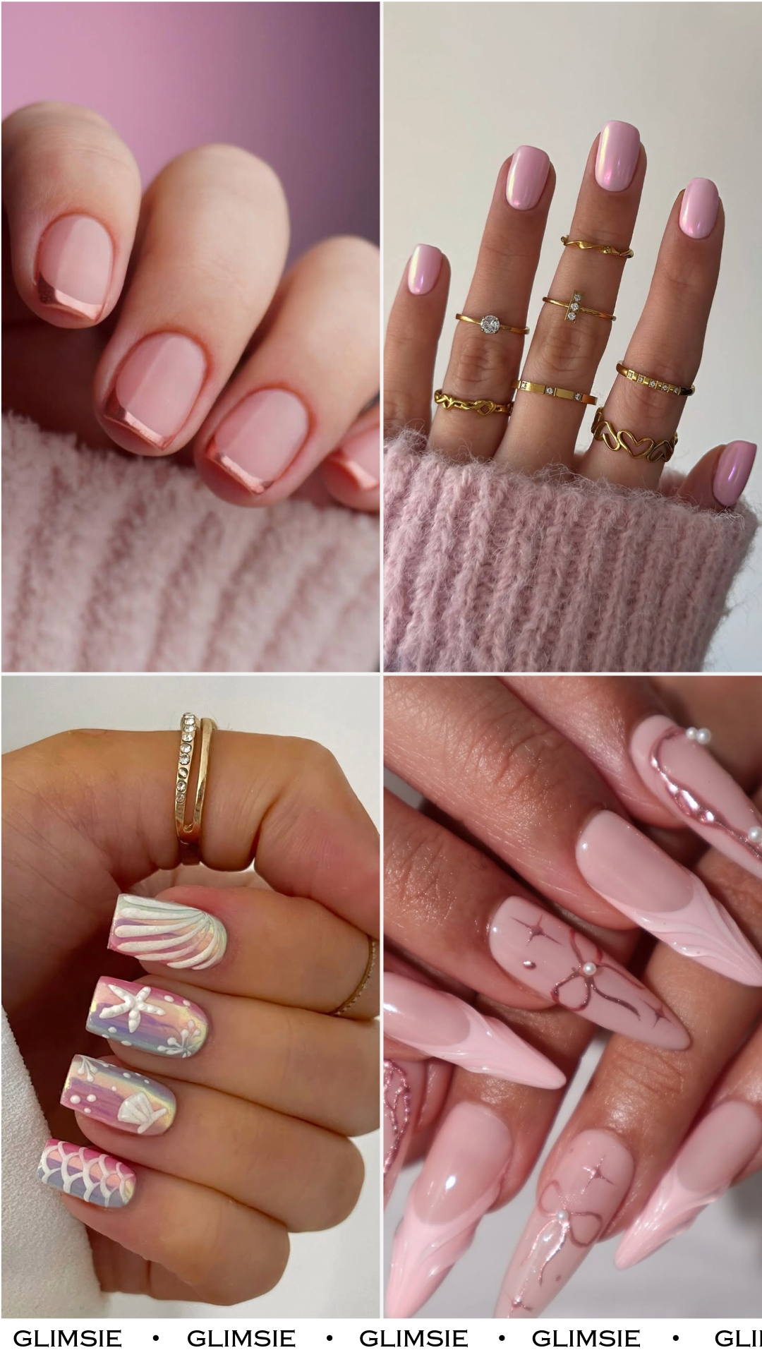 This set leans into that dreamy, glazed chrome look that’s been trending everywhere. The soft pink base topped with a subtle chrome sheen creates a luminous finish that almost looks like glass.