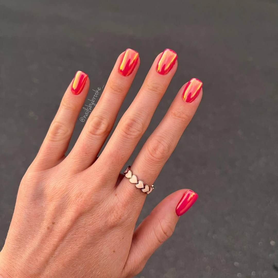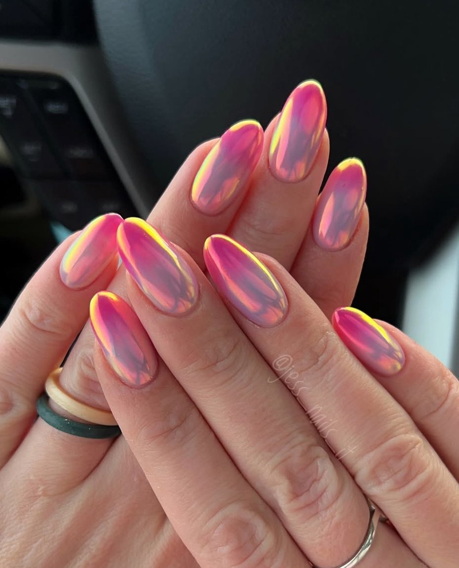 This manicure takes chrome pink to the next level with a magnetic, almost glowing finish. The reflective surface shifts between pink, gold, and peach tones depending on the light, giving it that mesmerizing cat-eye effect.