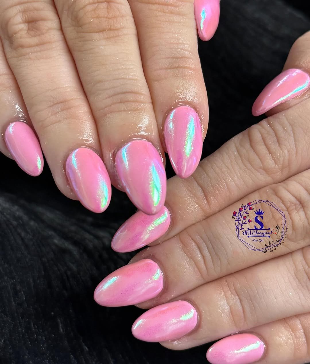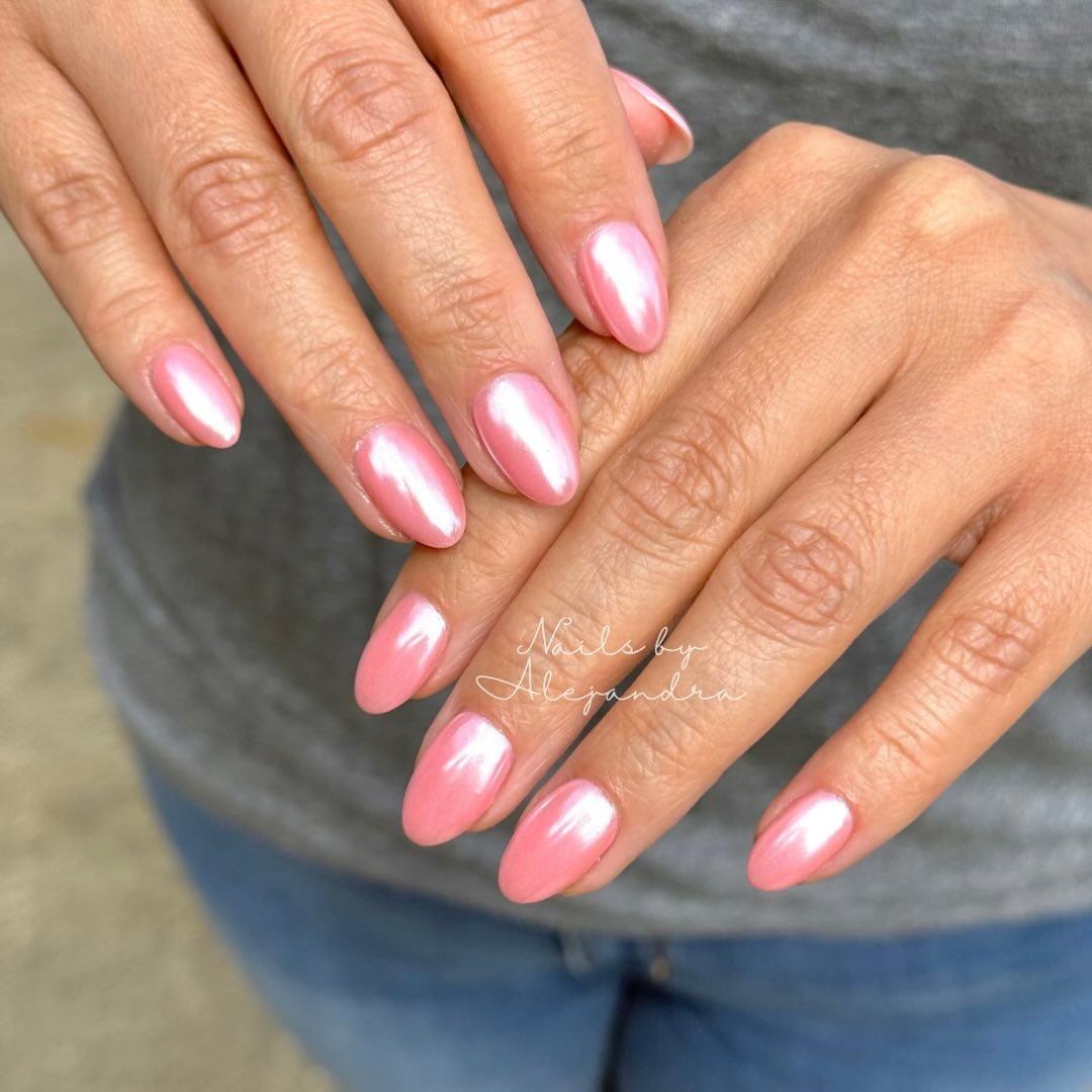 These soft chrome pink nails bring a delicate, almost ethereal vibe. The reflective pink sheen catches light beautifully, shifting between blush and pearl depending on the angle.
