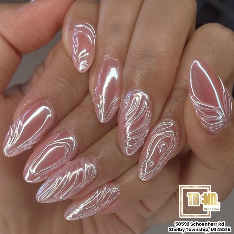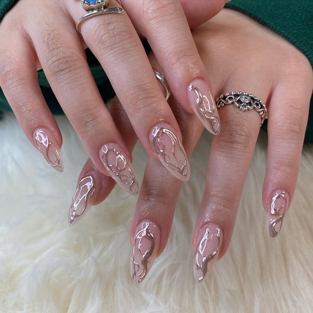 If you want chrome pink nails with a bit of edge, this sculpted design delivers. The soft nude base paired with metallic chrome waves creates a fluid, almost molten look that feels modern and artistic.
