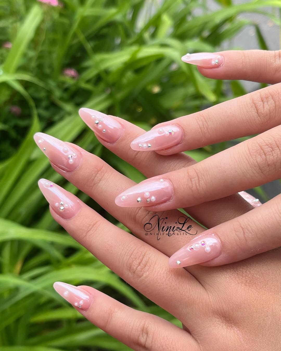 The long almond shape keeps the design elegant, while the crystals give it that little bit of glam. It’s the perfect balance between soft, shiny, and just a little extra.