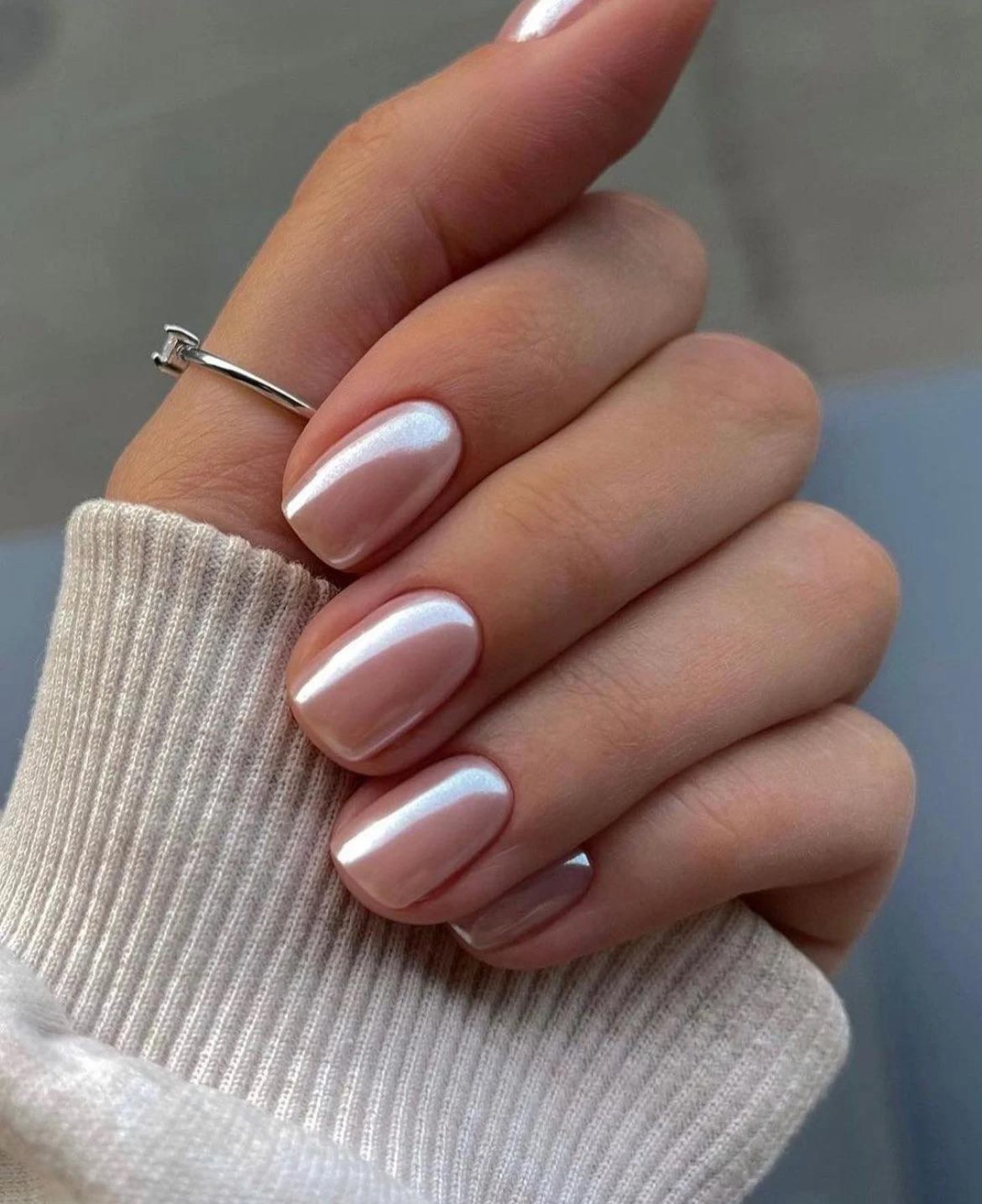 This manicure proves chrome pink doesn’t have to be loud to be beautiful. The delicate nude-pink base topped with a soft chrome sheen creates a silky, pearl-like finish that feels incredibly refined.