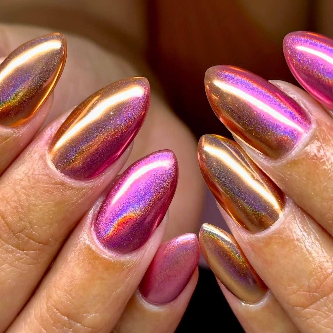 These nails look like a sunset captured in chrome. The shimmering finish shifts between gold, rose, and pink tones depending on the angle, giving the manicure a mesmerizing metallic gradient.