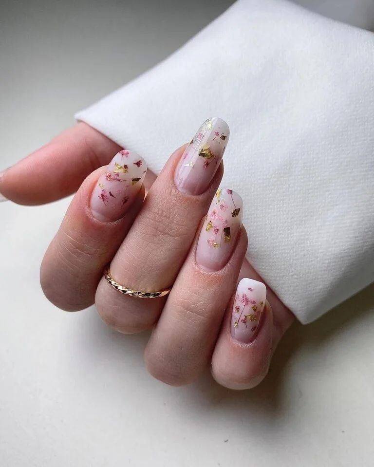 There’s something utterly luxurious about dried florals and gold foil embedded in milky pink polish. These nails feel like a pressed flower letter you’d tuck into a wedding keepsake box — organic, textured, and full of intention.