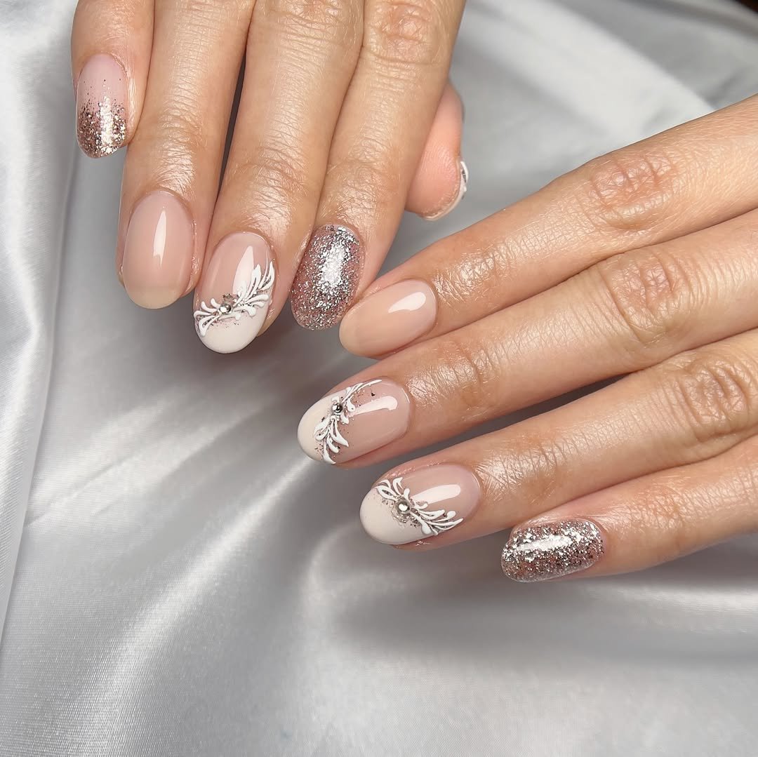 With a base of creamy blush and hand-painted white scrollwork, these nails look like vintage embroidery come to life. Add in rose-gold glitter accents, and you’ve got the perfect mix of softness and celebration. It’s delicate, but not shy.